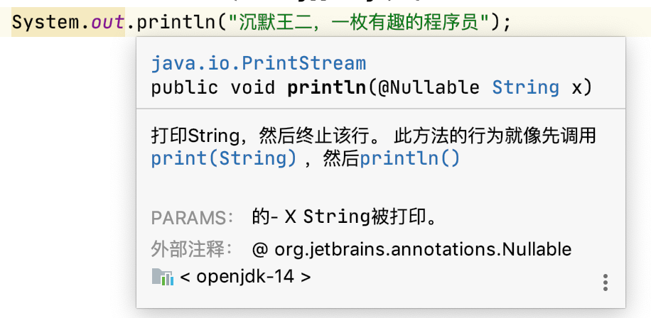 我们可以通过集成开发工具查看预先定义方法的方法签名,当我们把鼠标停留在 println() 方法上面时,就会显示下图中的内容: