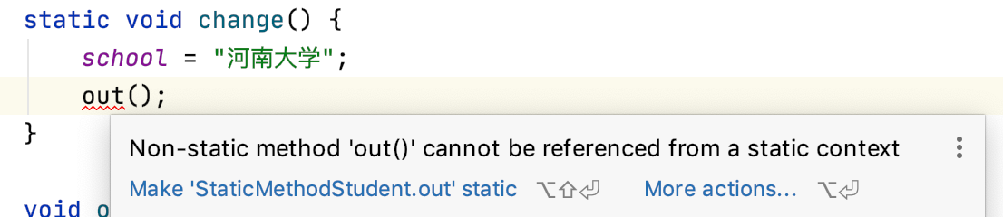 }“仔细听,三妹。change() 方法就是一个静态方法,所以它可以直接访问静态变量 school,把它的值更改为河南大学;并且,可以通过类名直接调用 change() 方法,就像 StaticMethodStudent.change() 这样。”