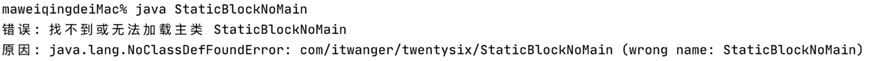 }“在命令行中执行 java StaticBlockNoMain 的时候,会抛出 NoClassDefFoundError 的错误。”
