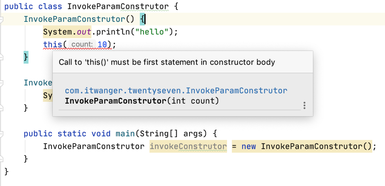 hello“不过,需要注意的是,this() 必须放在构造方法的第一行,否则就报错了。”