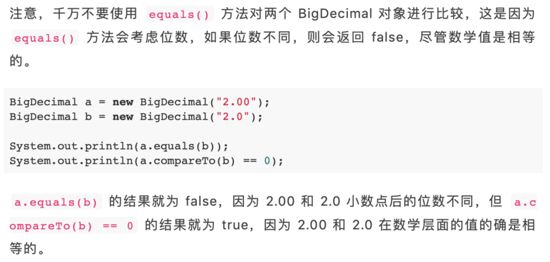 关于这一点,我之前在文章里详细地阐述了,浮点数之间的比较不能使用“==”操作符,而 BigDecimal 之间不能使用 equals() 比较。