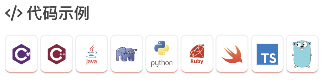 }当然了,代码示例不只有 Java 版的,还有 C#、C++、Python、Go 等 8 种常见的编程语言。