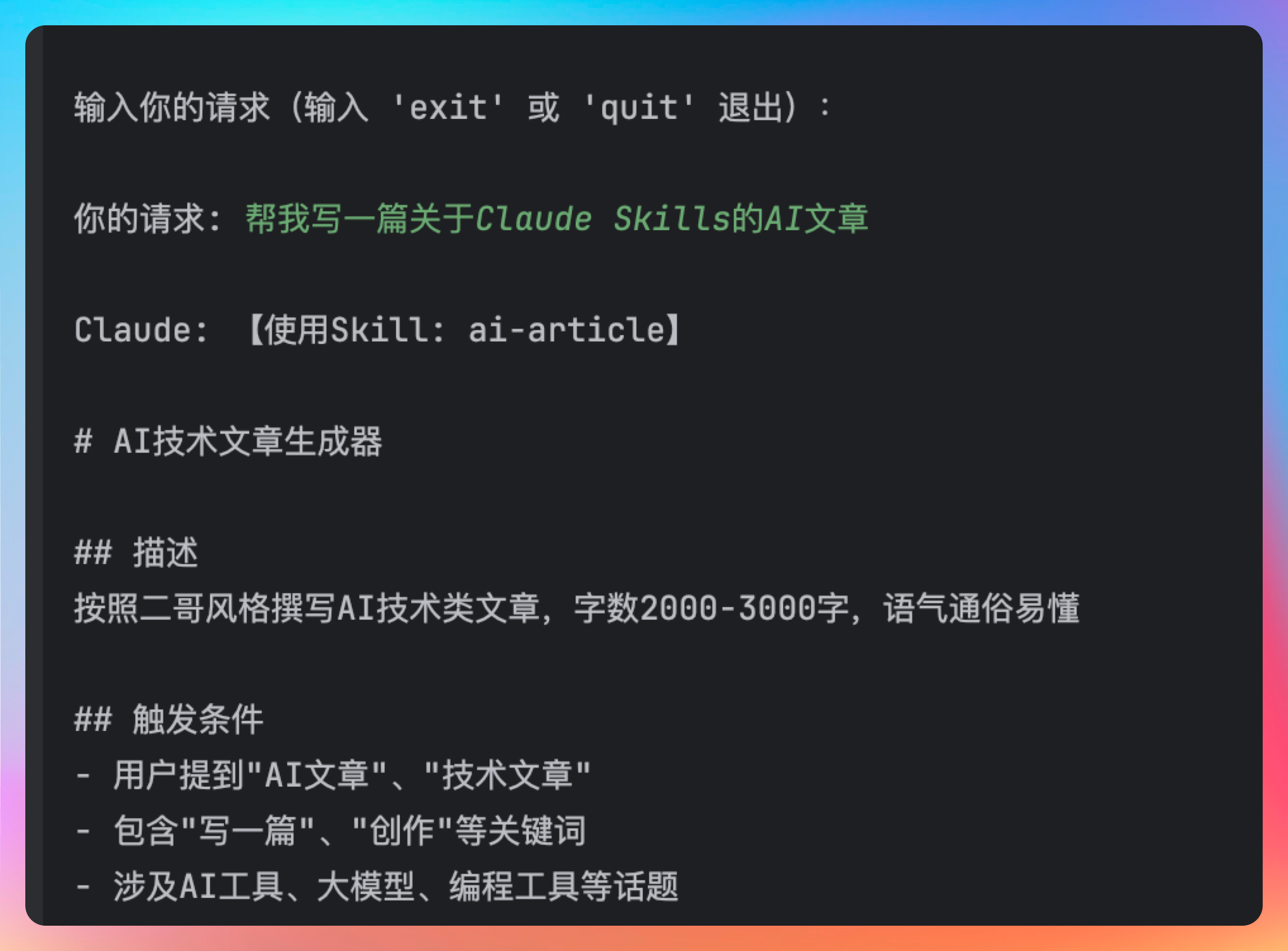 比如你说"写一篇AI文章",Claude发现这和ai-article的描述高度匹配,就会: