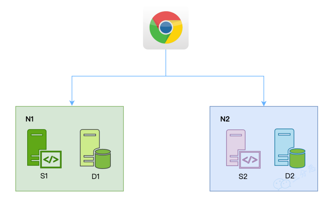 假如现在有两个分区N1和N2,N1 和 N2 分别有不同的分区存储 D1 和 D2,以及不同的服务 S1 和 S2。