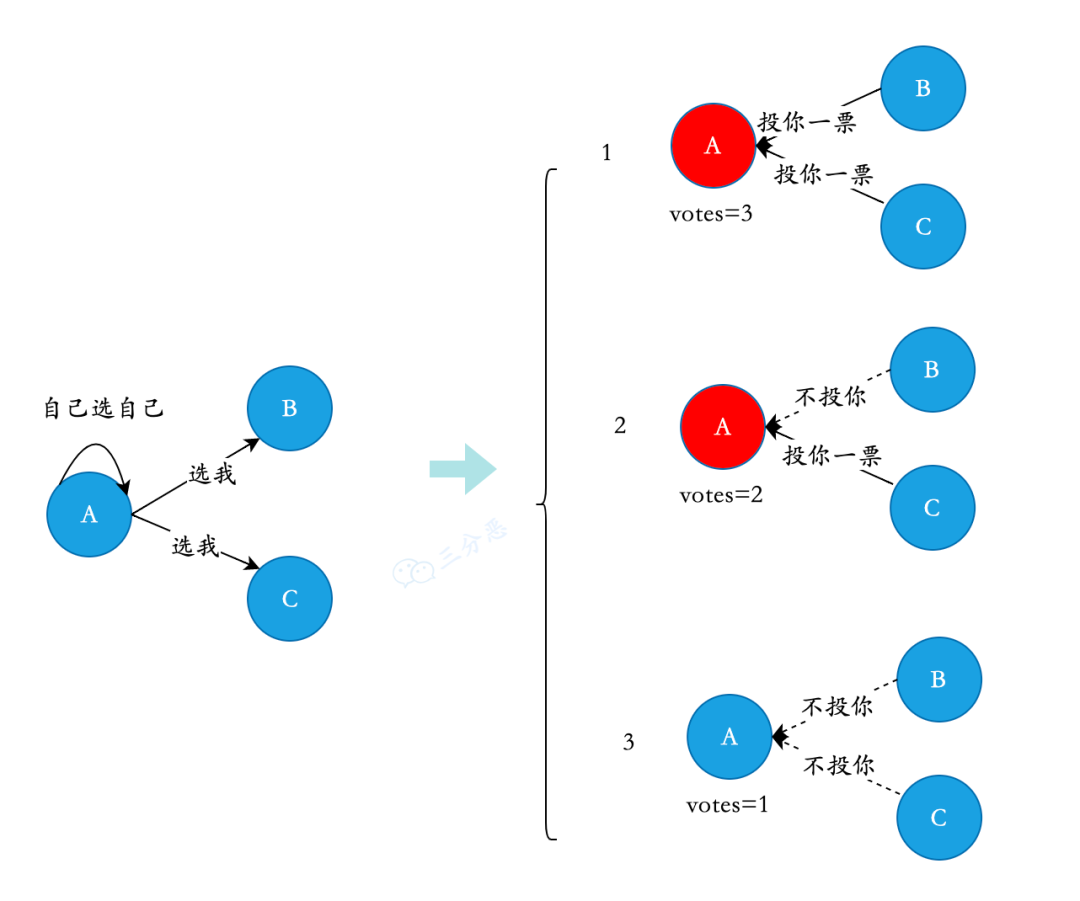 那么首先开启一轮大选。在大选期间 所有跟随者 都能参与竞选,这时所有跟随者的角色就变成了 候选人,民主投票选出领袖后就开始了这届领袖的任期,然后选举结束,所有除 领导者 的 候选人 又变回 跟随者 服从领导者领导。