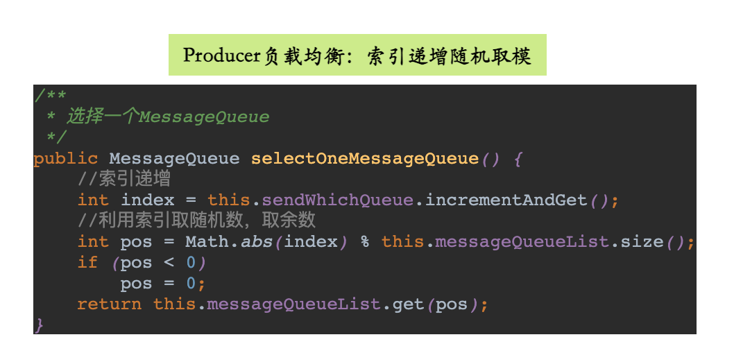Producer 端在发送消息的时候,会先根据 Topic 找到指定的 TopicPublishInfo,在获取了 TopicPublishInfo 路由信息后,RocketMQ 的客户端在默认方式下 selectOneMessageQueue()方法会从 TopicPublishInfo 中的 messageQueueList 中选择一个队列(MessageQueue)进行发送消息。具这里有一个 sendLatencyFaultEnable 开关变量,如果开启,在随机递增取模的基础上,再过滤掉 not available 的 Broker 代理。