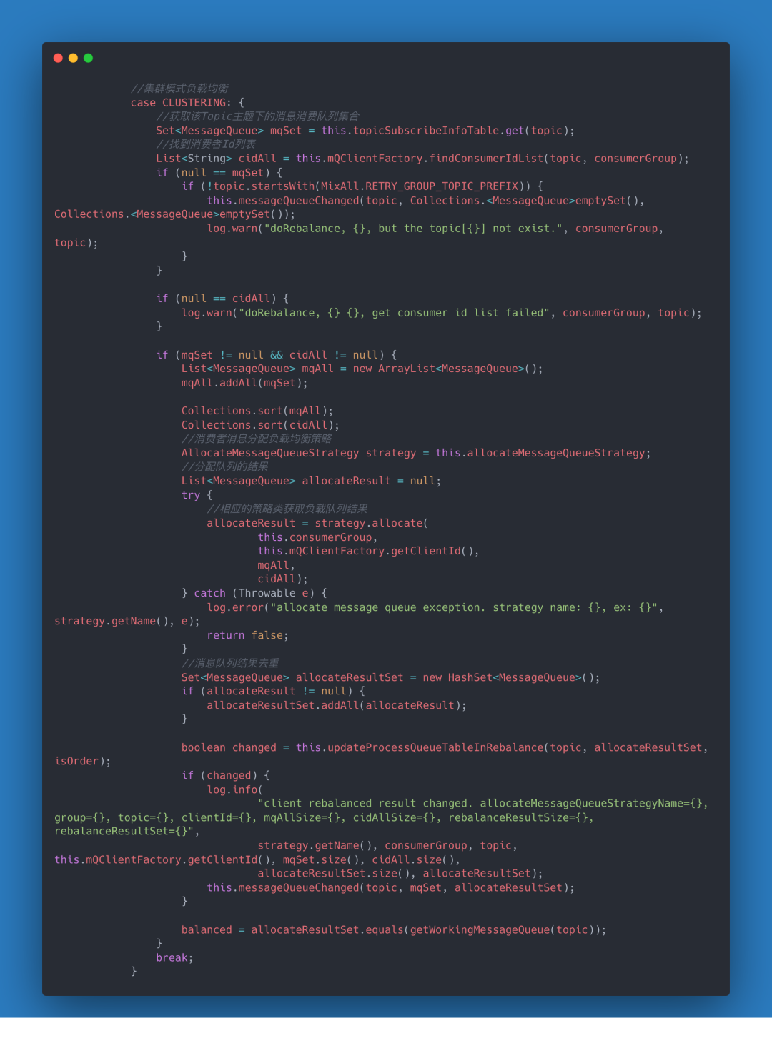 消息消费队列在同一消费组不同消费者之间的负载均衡,其核心设计理念是在一个消息消费队列在同一时间只允许被同一消费组内的一个消费者消费,一个消息消费者能同时消费多个消息队列。