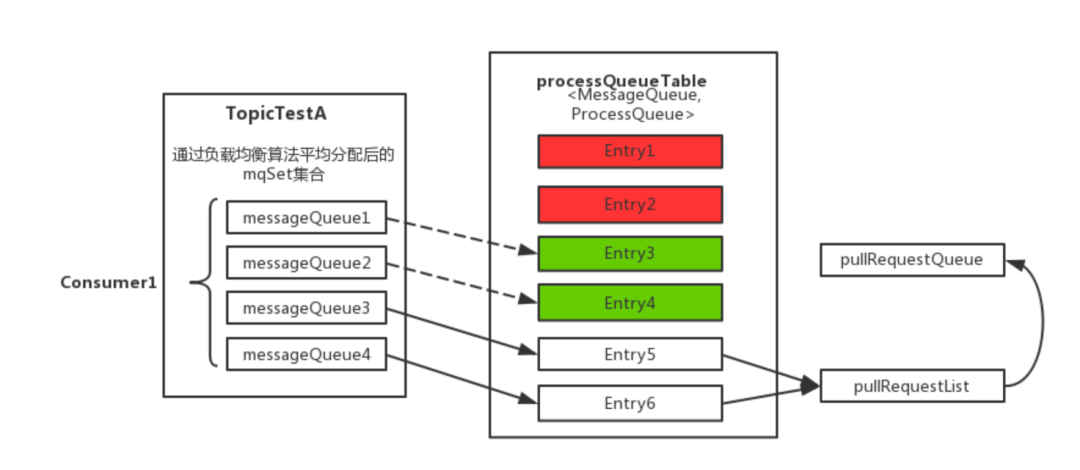 - 上图中 processQueueTable 的绿色部分,表示与分配到的消息队列集合 mqSet 的交集。判断该 ProcessQueue 是否已经过期了,在 Pull 模式的不用管,如果是 Push 模式的,设置 Dropped 属性为 true,并且调用 removeUnnecessaryMessageQueue()方法,像上面一样尝试移除 Entry;