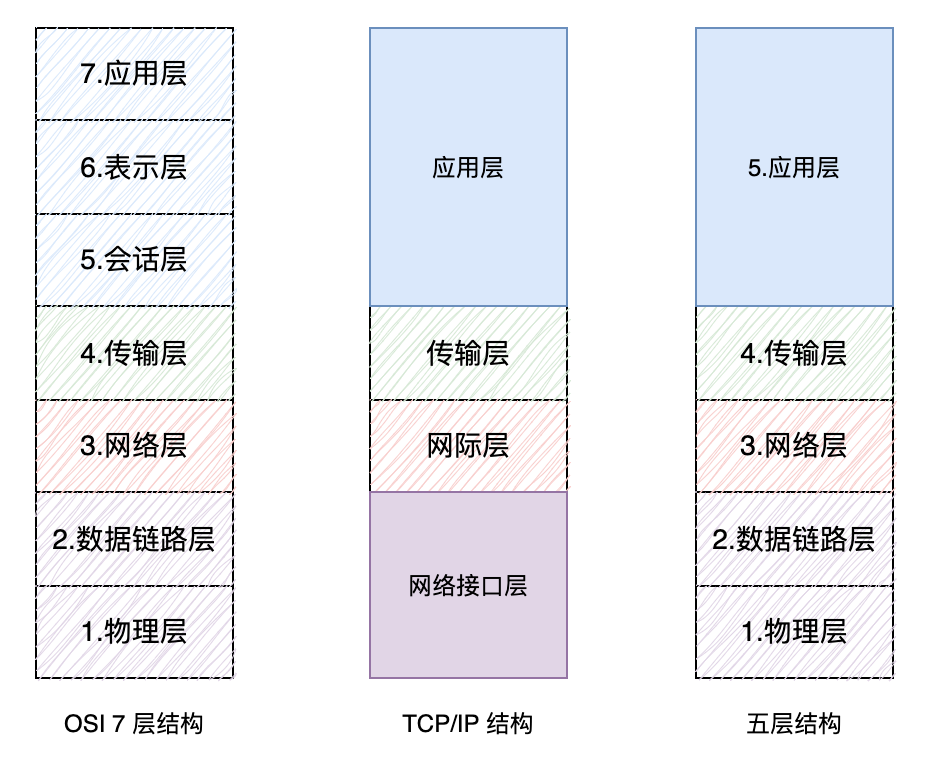 互联网实际使用的 TCP/IP 模型并不是对应到 OSI 的 7 层模型,而是大致对应 OSI 的 5 层模型: