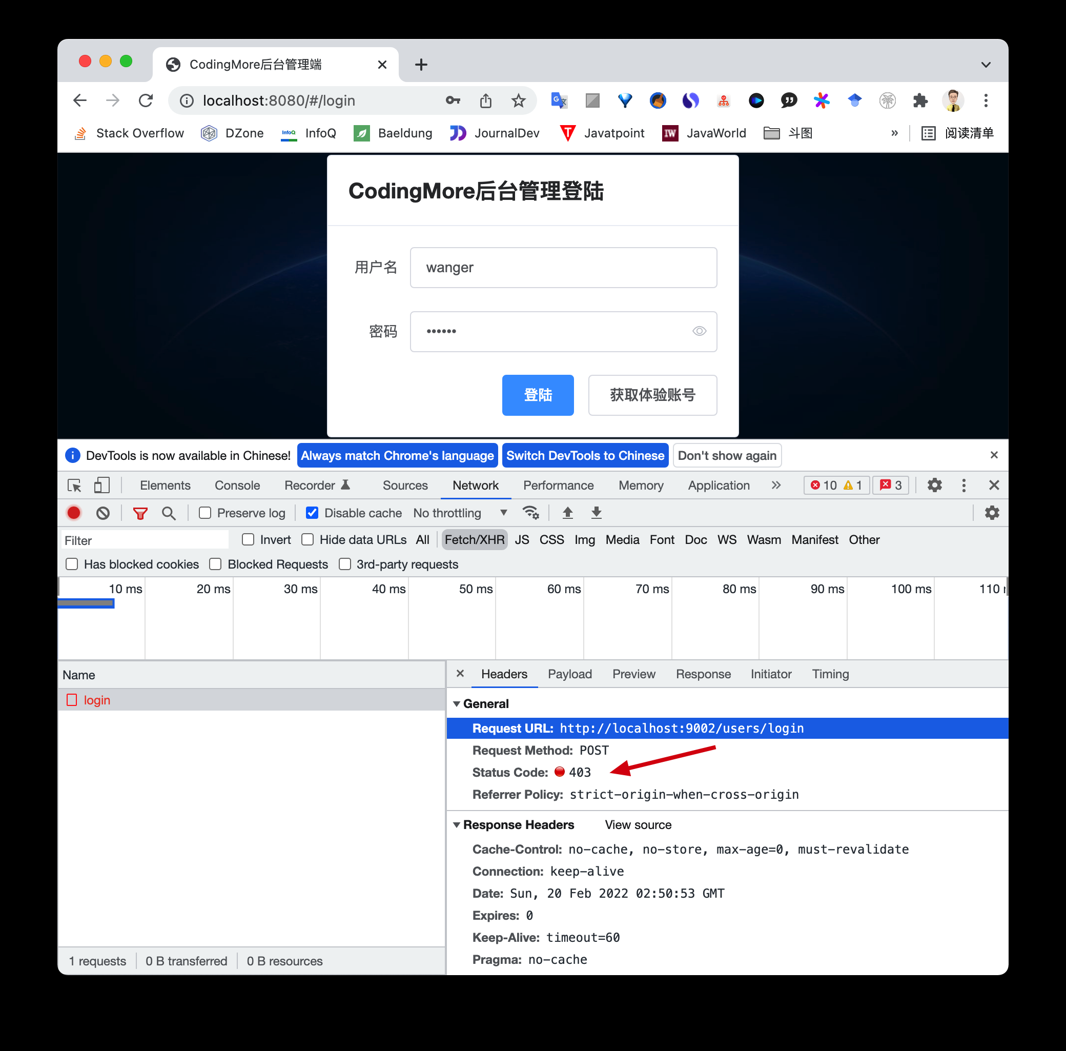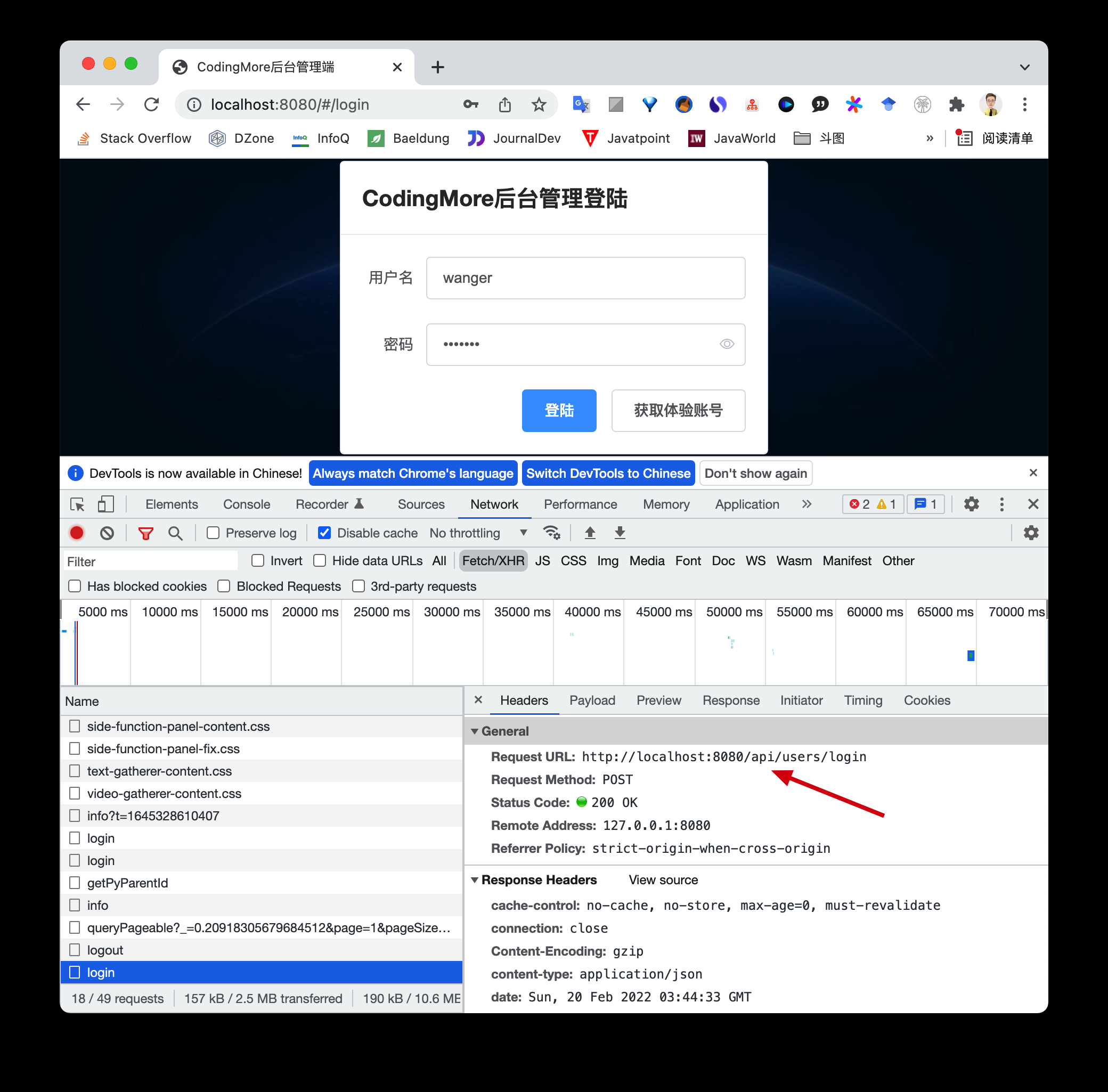 }第二步,重启后端服务,再次点击登录按钮,发现请求已经可以正常访问了。