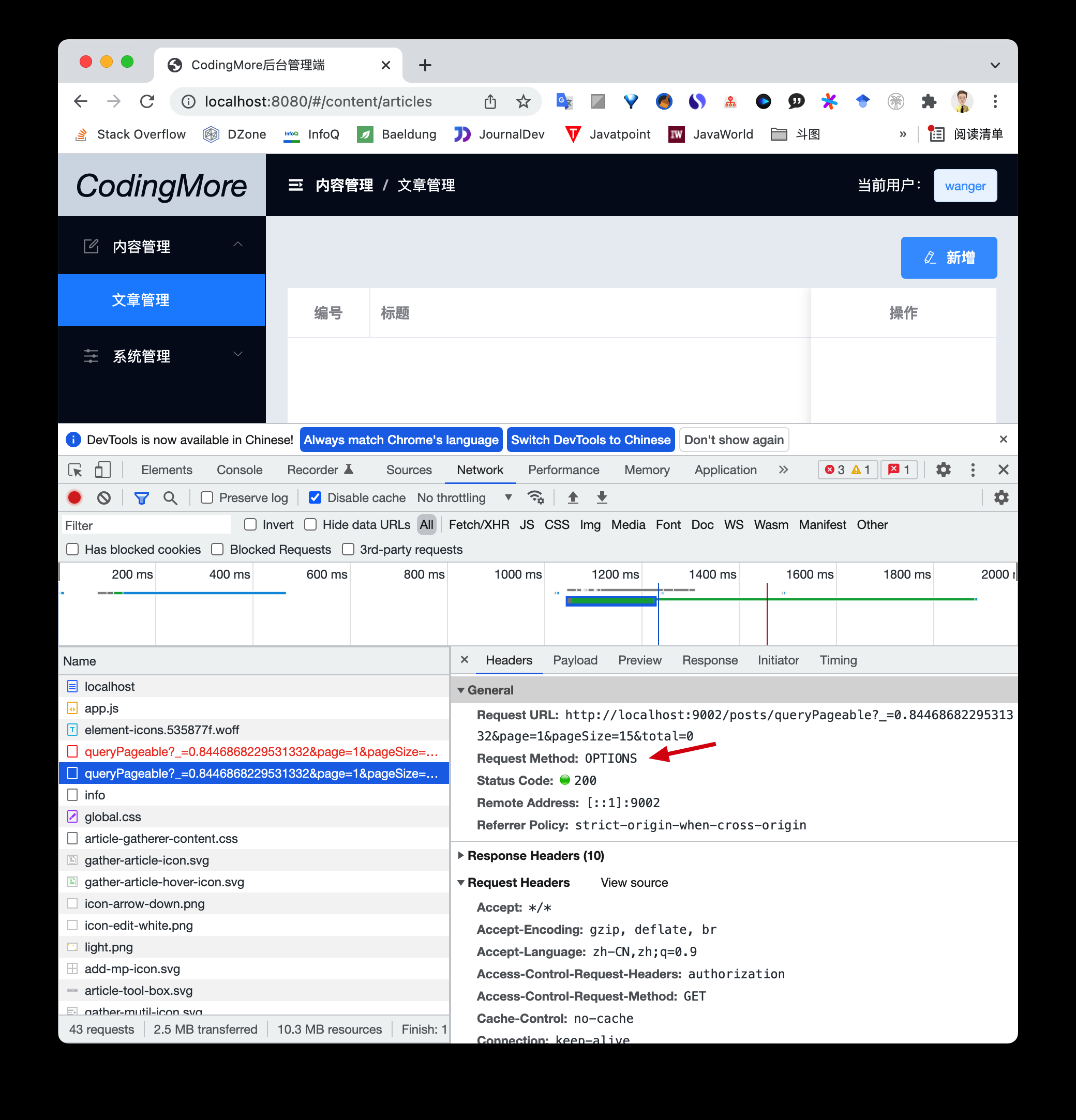 拿编程猫的文章管理页来举例,该页面会向后端发起一个 posts/queryPageable 的分页查询,该请求包含了一个自定义的消息头 Authorization,于是浏览器认为该请求是一个非简单请求,然后就会自动发起一次 OPTIONS 请求,但由于我们的 Spring Boot 项目整合了 SpringsScurity 安全管理框架,没有对OPTIONS请求放开登录认证,导致验证失败,文章分页请求的响应数据就没有返回回来。