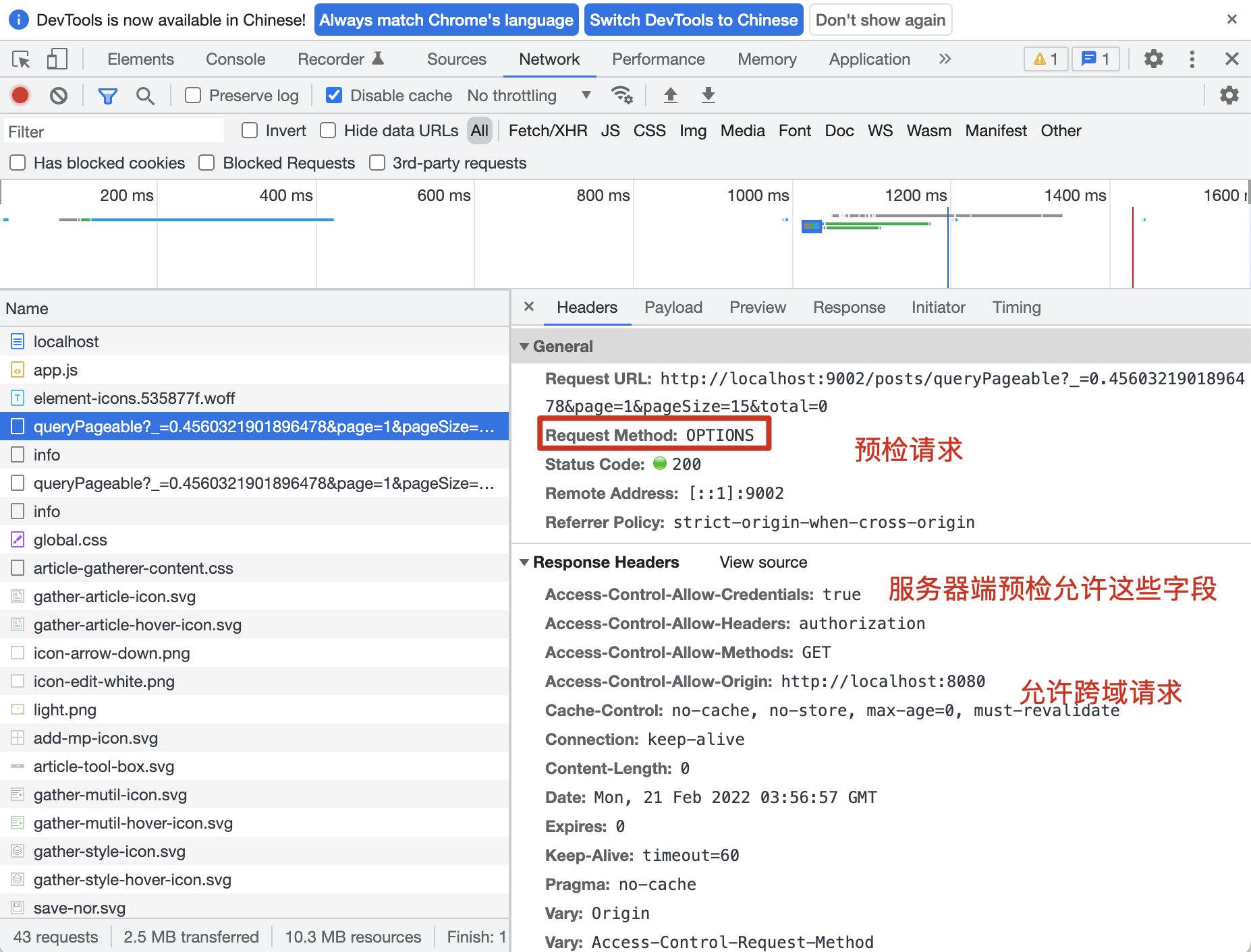 我们来通过两张图片简单总结一下预检请求的整个过程,第一张,发起 OPTIONS 预检请求: