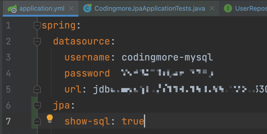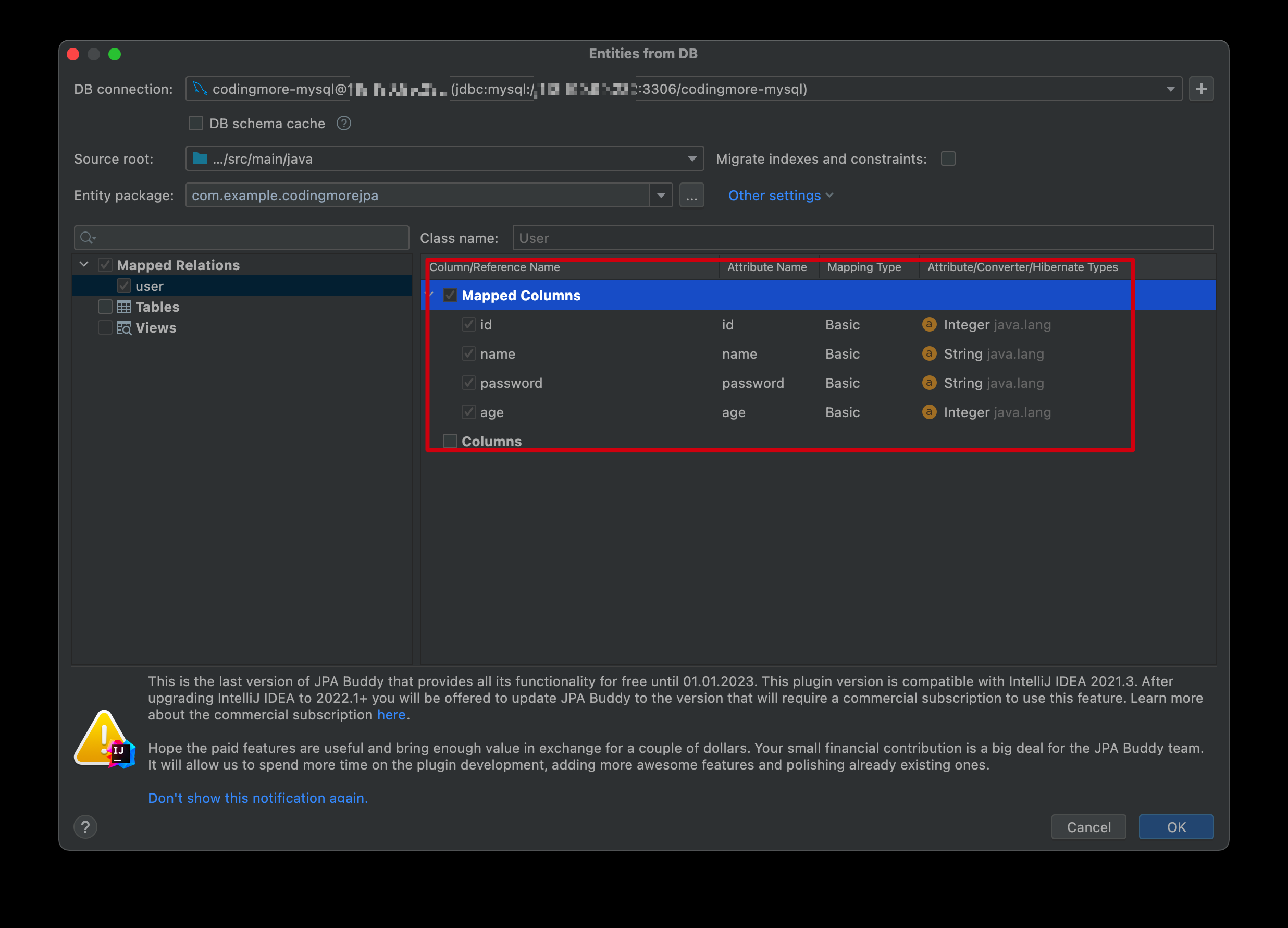 url: jdbc:mysql://xxxx:3306/codingmore-mysql?useUnicode=true&characterEncoding=utf-8&serverTimezone=Asia/Shanghai&useSSL=false第三步,新建实体类 User.java。