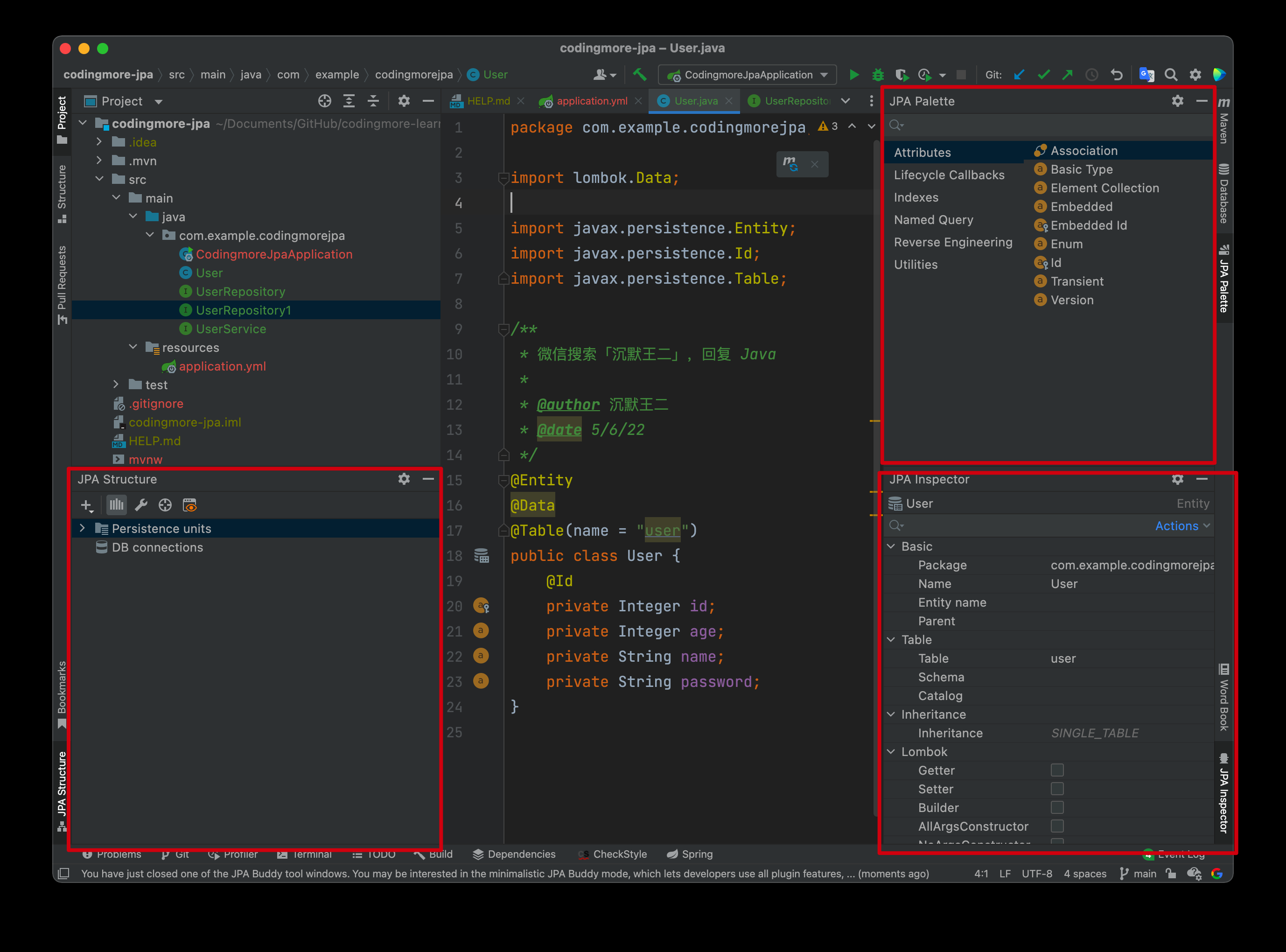 安装完 JPA Buddy 插件后,当我们创建好实体类后,会自动打开三个面板:JPA Structure,JPA Palette和JPA Inspector。