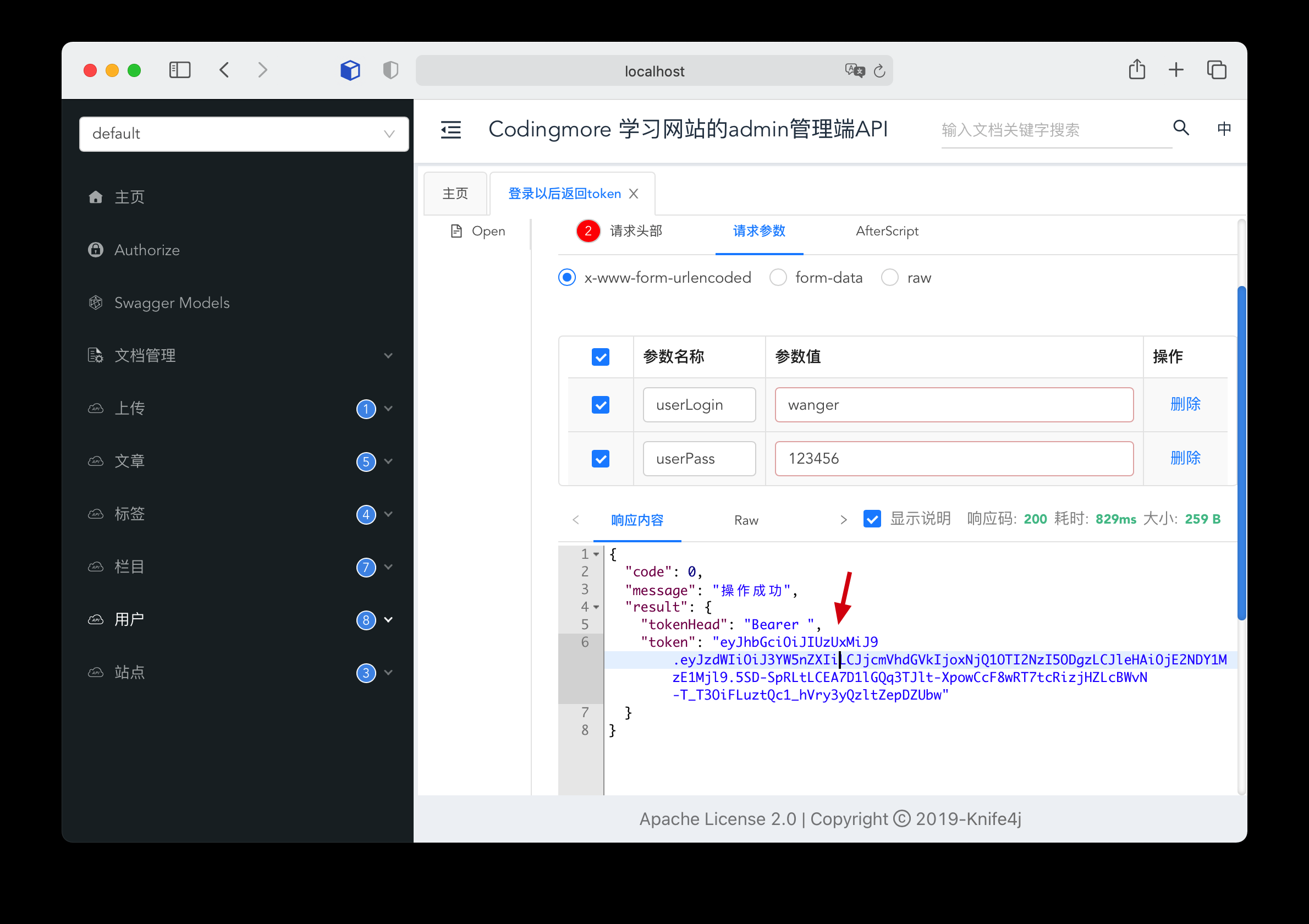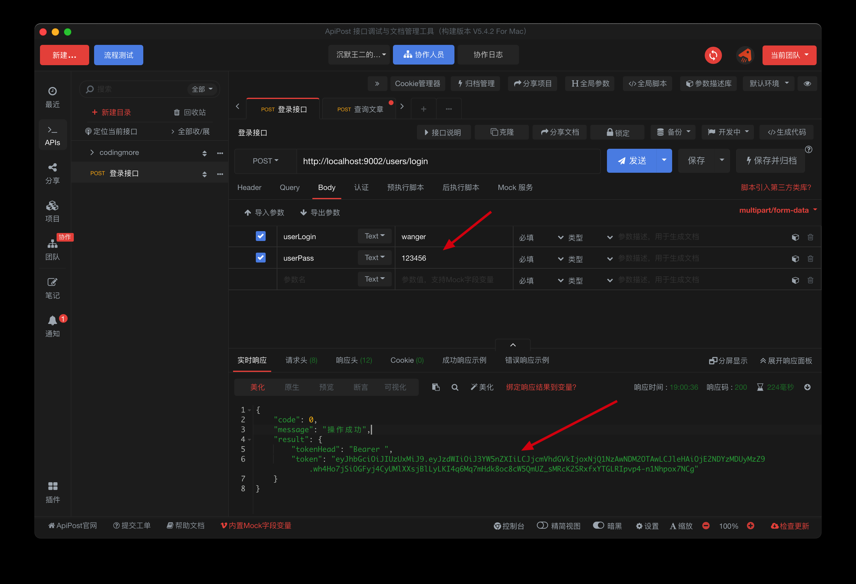 第一步,访问 login 接口,输入用户名和密码进行登录,获取服务器端返回的 JWT。