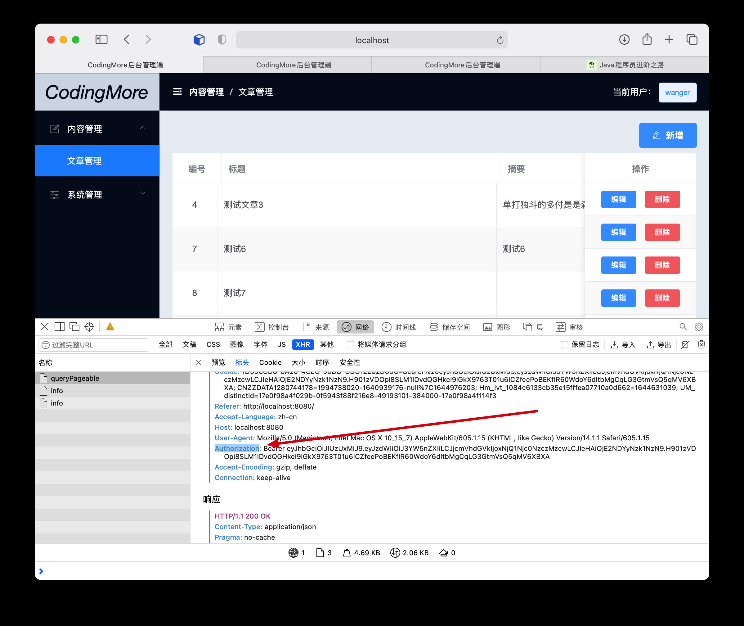 假如我现在使用用户名 wanger 和密码 123456 进行访问编程喵(Codingmore)的 login 接口,那么实际的 JWT 是一串看起来像是加过密的字符串。