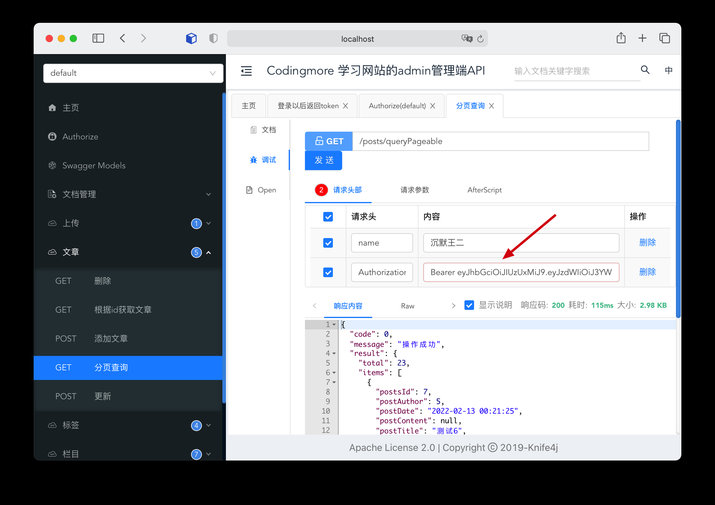 第三步,再次请求其他接口时,Swagger 会自动将 Authorization 作为请求头信息发送到服务器端。