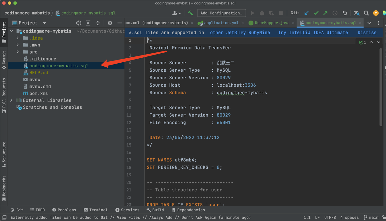 url: jdbc:mysql://localhost:3306/codingmore-mybatis?useUnicode=true&characterEncoding=utf-8&serverTimezone=Asia/Shanghai&useSSL=false第三步,导入 SQL 文件。