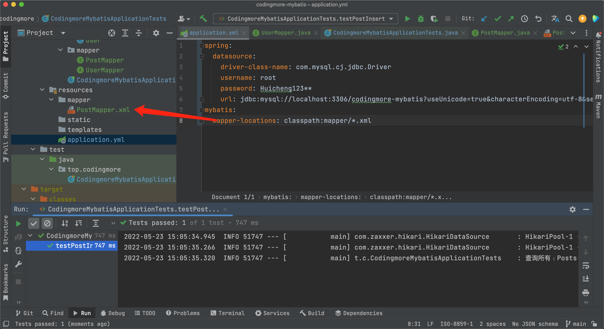 }第二步,在 resources 目录下新建 PostMapper.xml 文件。