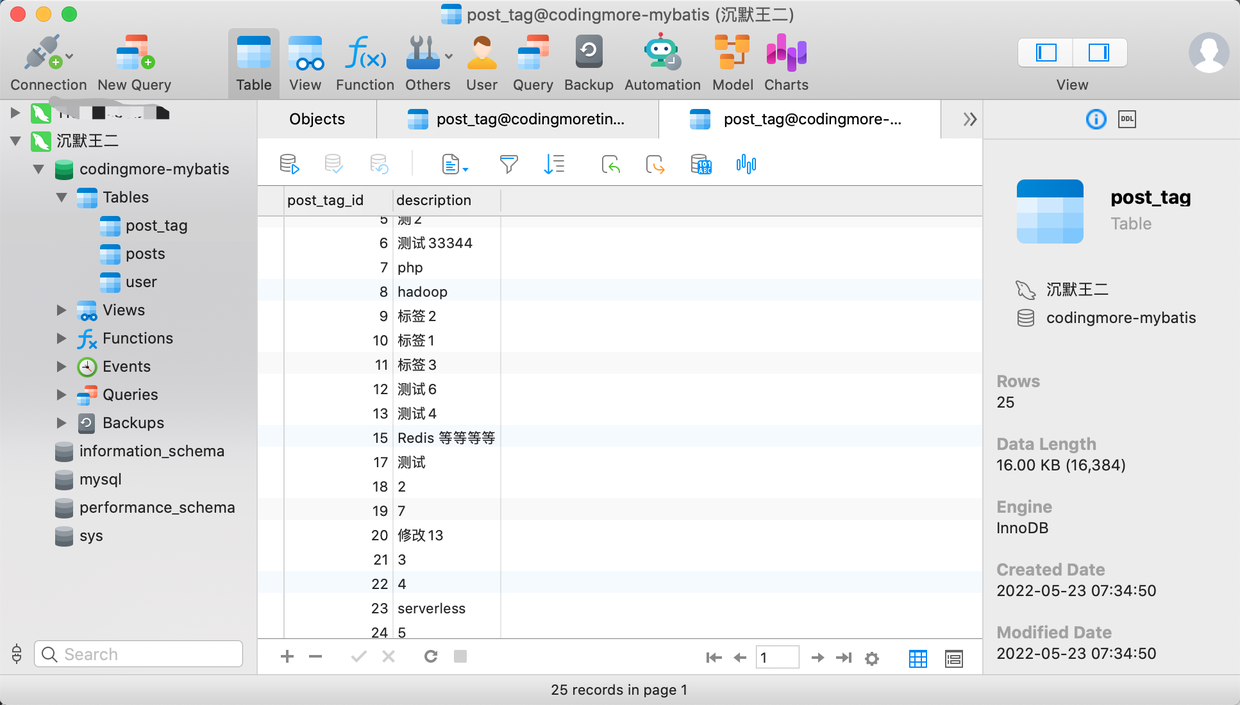 可以看得出,类名 PostTag,字段名 postTagId 和数据库表 post_tag、字段名 post_tag_id 并不一致,但 mp 自动帮我们做了映射关联。