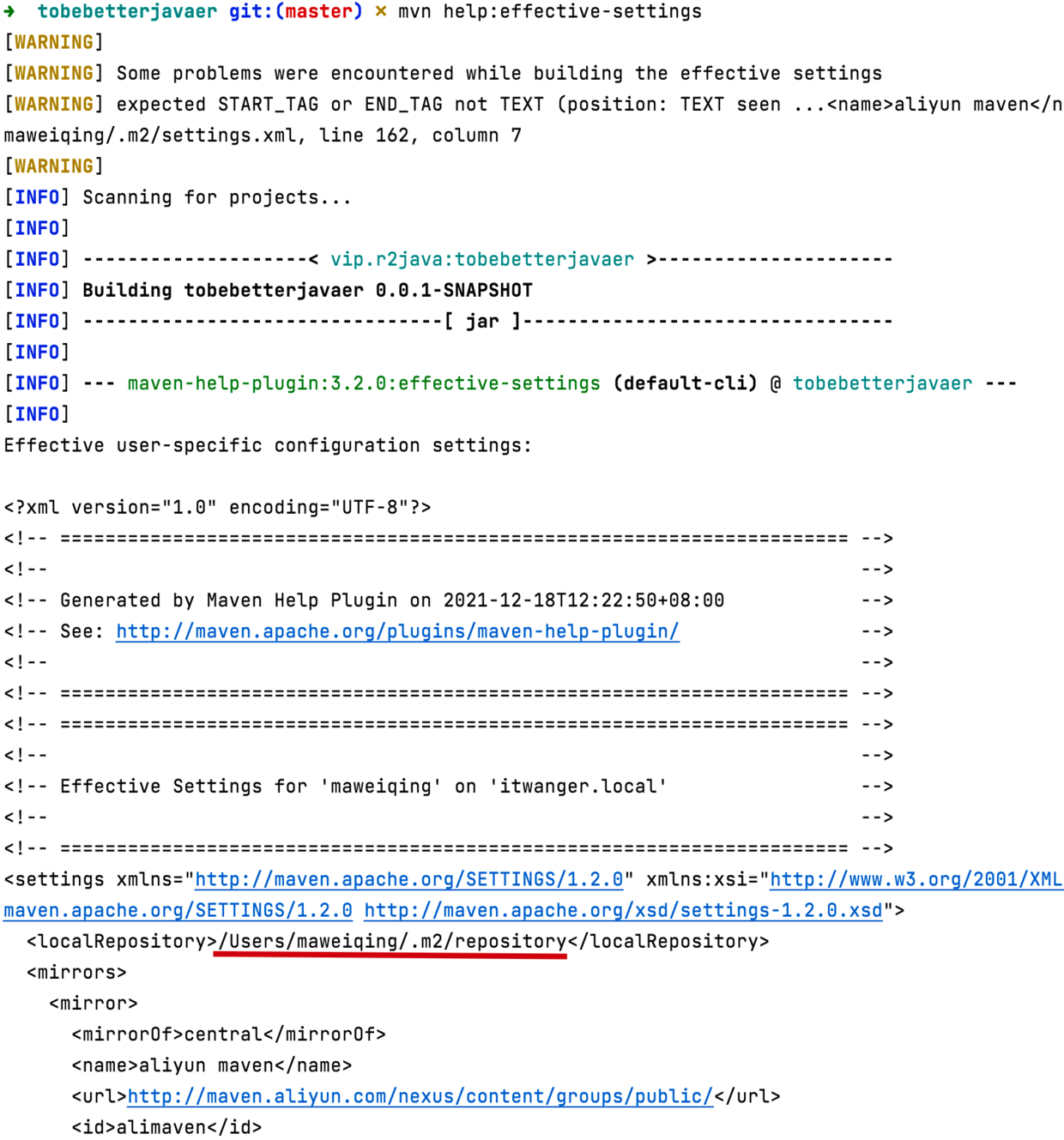 如果你不确定自己的 Maven 本地仓库在哪里,可以在终端执行 mvn help:effective-settings 命令。