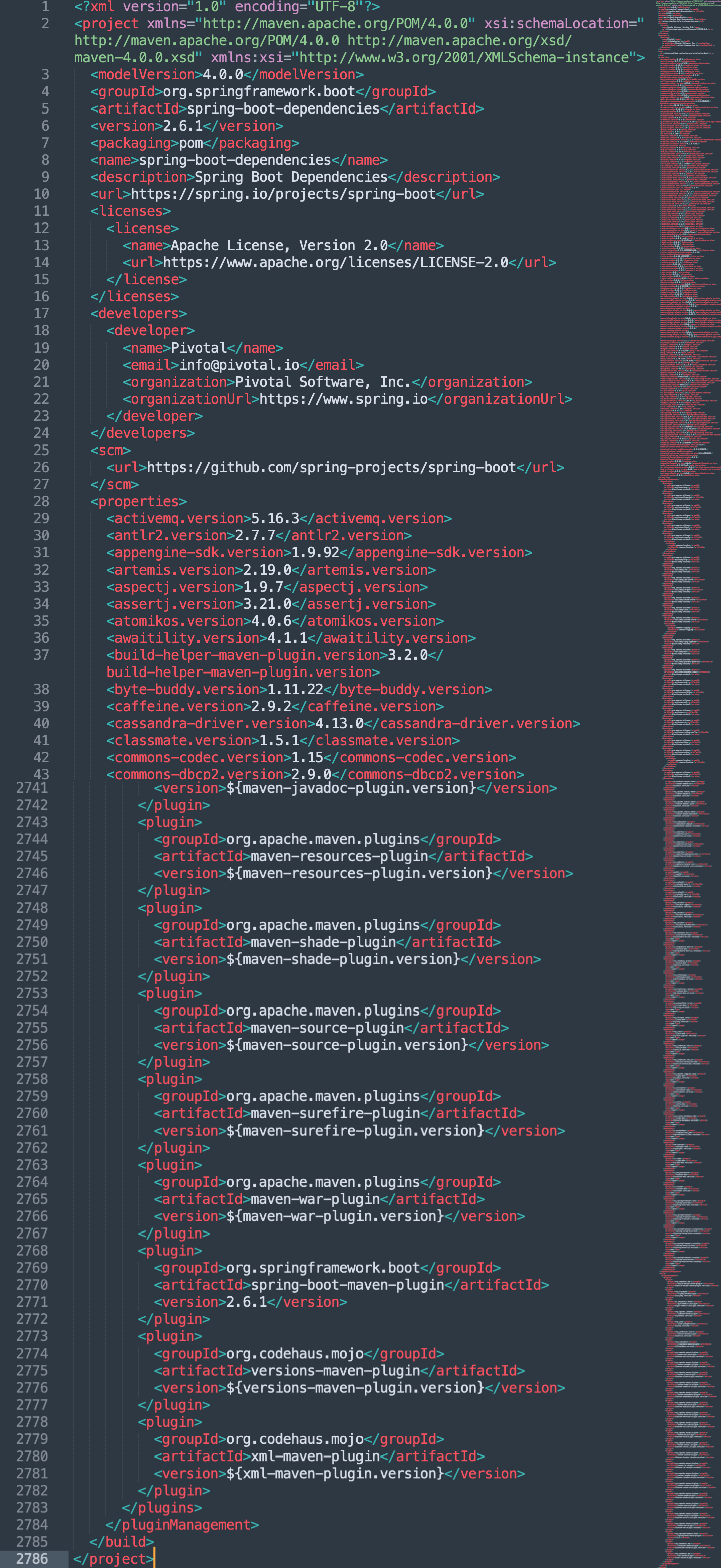 照葫芦画瓢,我们按照同样的方法找到 spring-boot-dependencies.pom 文件。可以看到这里面定义了一系列的属性和依赖,差不多 2800 行。