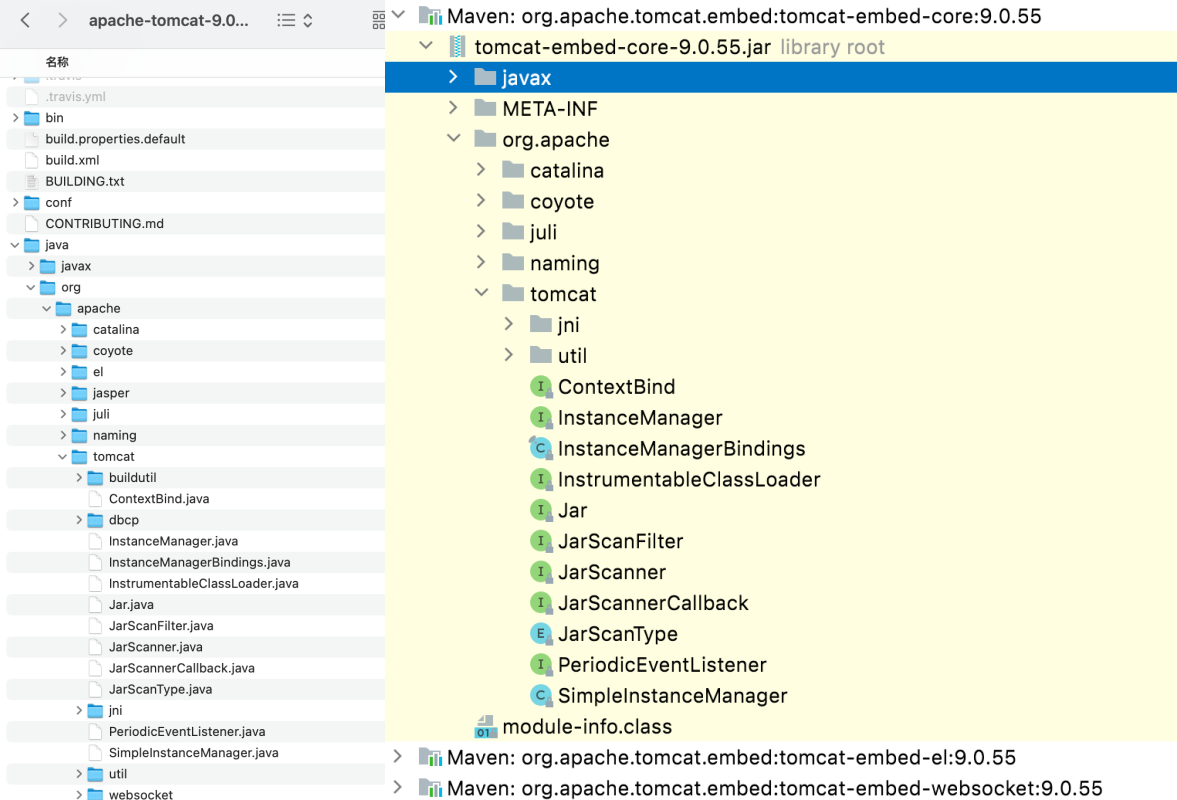 对比之下可以看得出,Spring Boot 引入的 Tomcat 更精简一点,大体上都是相同的,这也就是为什么Spring Boot 不需要额外安装 Tomcat 的根本原因了。