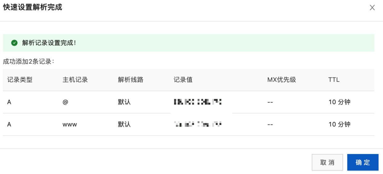 该方法可以同时添加 www 和 @ 记录,成功后,可以通过带 www 和不带 www 的方式访问网站。