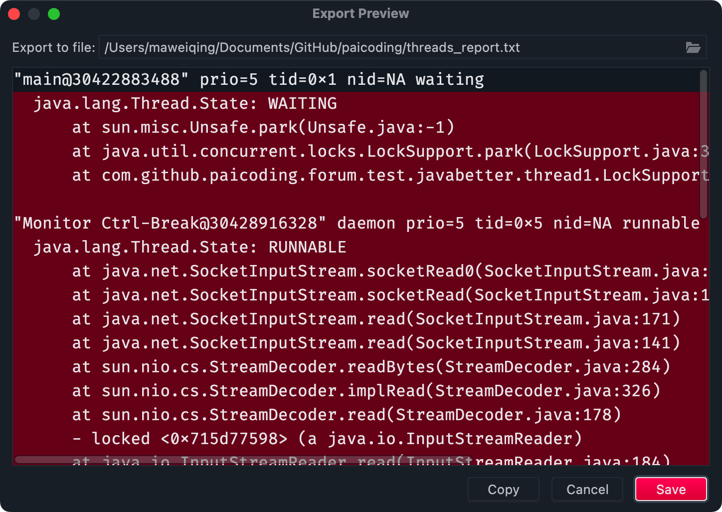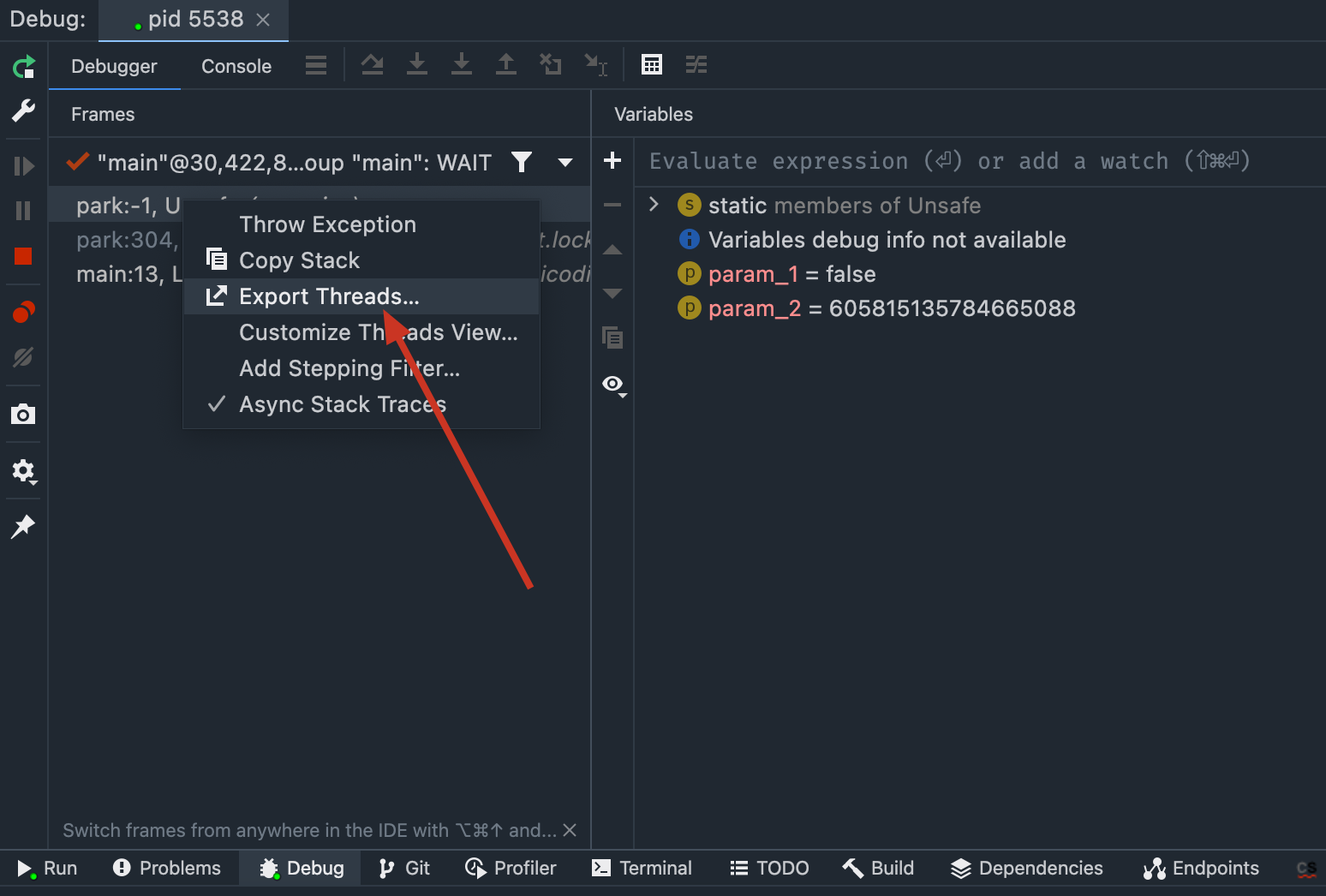 下面是一个简单的例子,通过 LockSupport 阻塞线程,然后通过 Intellij IDEA 查看 dump 线程信息。