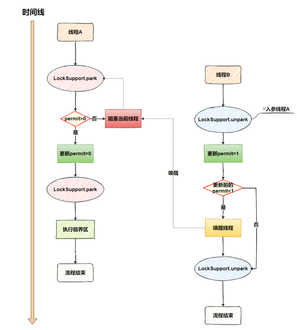 LockSupport.unpark:指定线程关联的 permit 直接更新为 1,如果更新前的permit<1,唤醒指定线程LockSupport.park:当前线程关联的 permit 如果>0,直接把 permit 更新为 0,否则阻塞当前线程