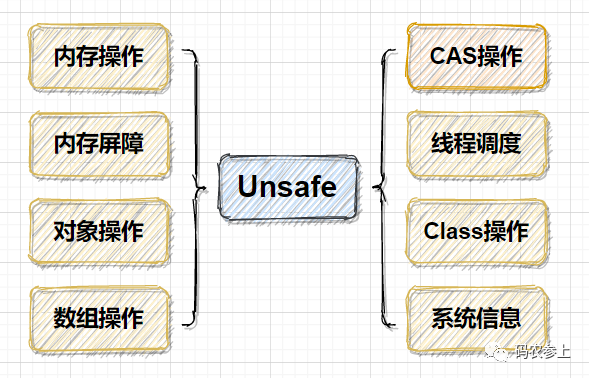 说到底,还是因为它实现的功能过于底层,例如直接进行内存操作、绕过 jvm 的安全检查创建对象等等,概括的来说,Unsafe 类实现的功能可以被分为下面 8 类: