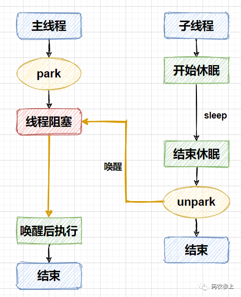 unpark mainThread success程序运行的流程也比较容易看懂,子线程开始运行后先进行睡眠,确保主线程能够调用park方法阻塞自己,子线程在睡眠 5 秒后,调用unpark方法唤醒主线程,使主线程能继续向下执行。整个流程如下图所示: