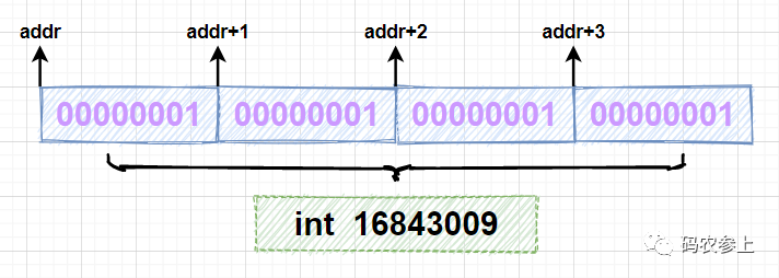 72340172838076673分析一下运行结果,首先使用allocateMemory方法申请 4 字节长度的内存空间,在循环中调用setMemory方法向每个字节写入内容为byte类型的 1,当使用 Unsafe 调用getInt方法时,因为一个int型变量占 4 个字节,会一次性读取 4 个字节,组成一个int的值,对应的十进制结果为 16843009,可以通过图示理解这个过程: