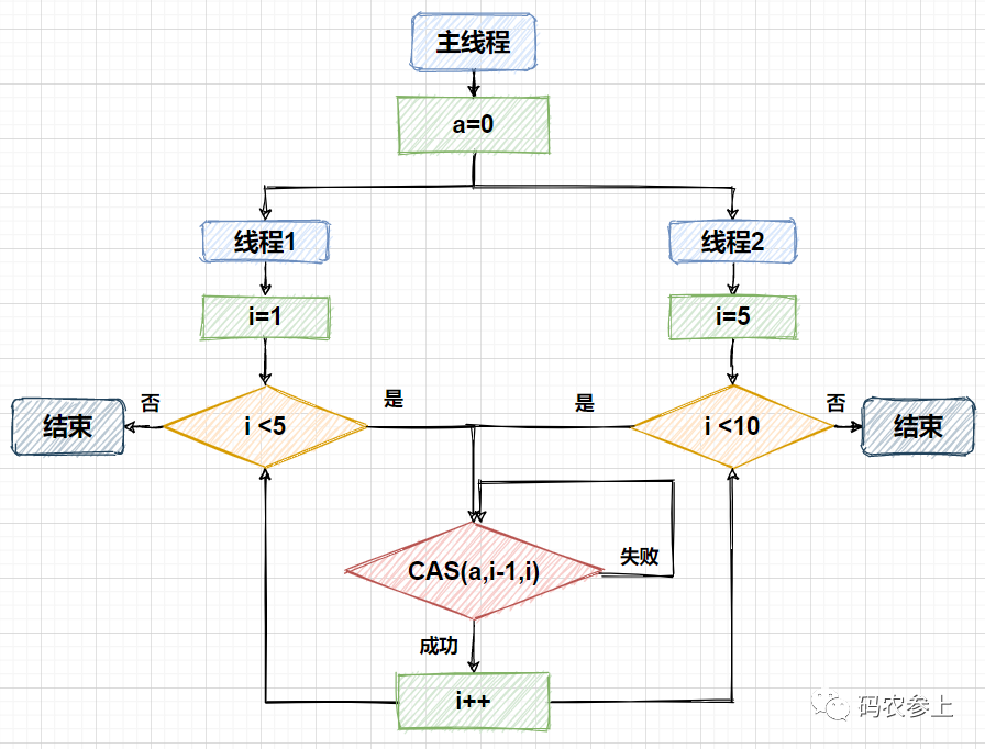 1 2 3 4 5 6 7 8 9在上面的例子中,使用两个线程去修改int型属性a的值,并且只有在a的值等于传入的参数x减一时,才会将a的值变为x,也就是实现对a的加一的操作。流程如下所示: