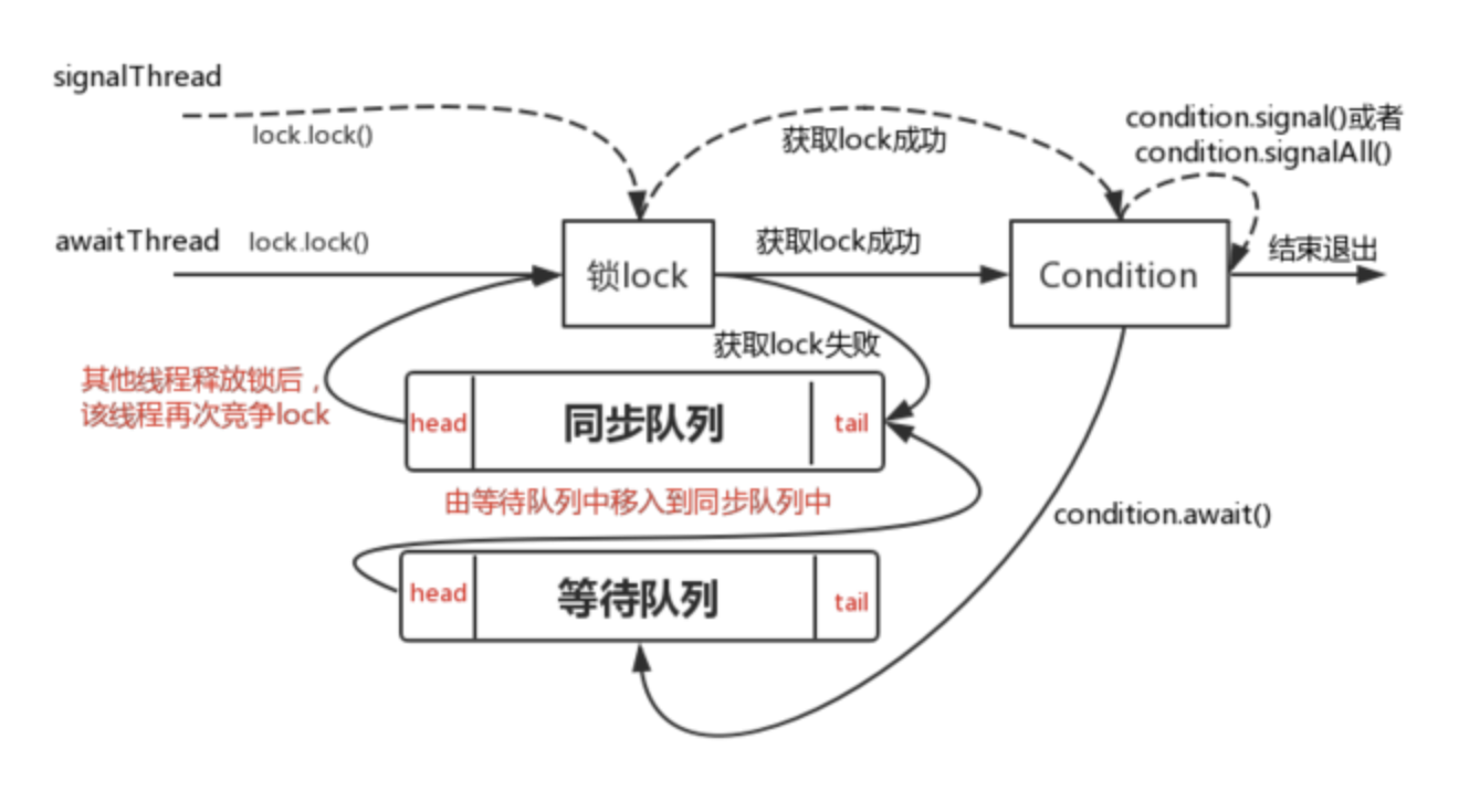线程 awaitThread 先通过 lock.lock() 方法获取锁,成功后调用 condition.await 方法进入等待队列,而另一个线程 signalThread 通过 lock.lock() 方法获取锁成功后调用了 condition.signal 或者 signalAll 方法,使得线程 awaitThread 能够有机会移入到同步队列中,当其他线程释放 lock 后使得线程 awaitThread 能够有机会获取 lock,从而使得线程 awaitThread 能够从 await 方法中退出并执行后续操作。如果 awaitThread 获取 lock 失败会直接进入到同步队列。