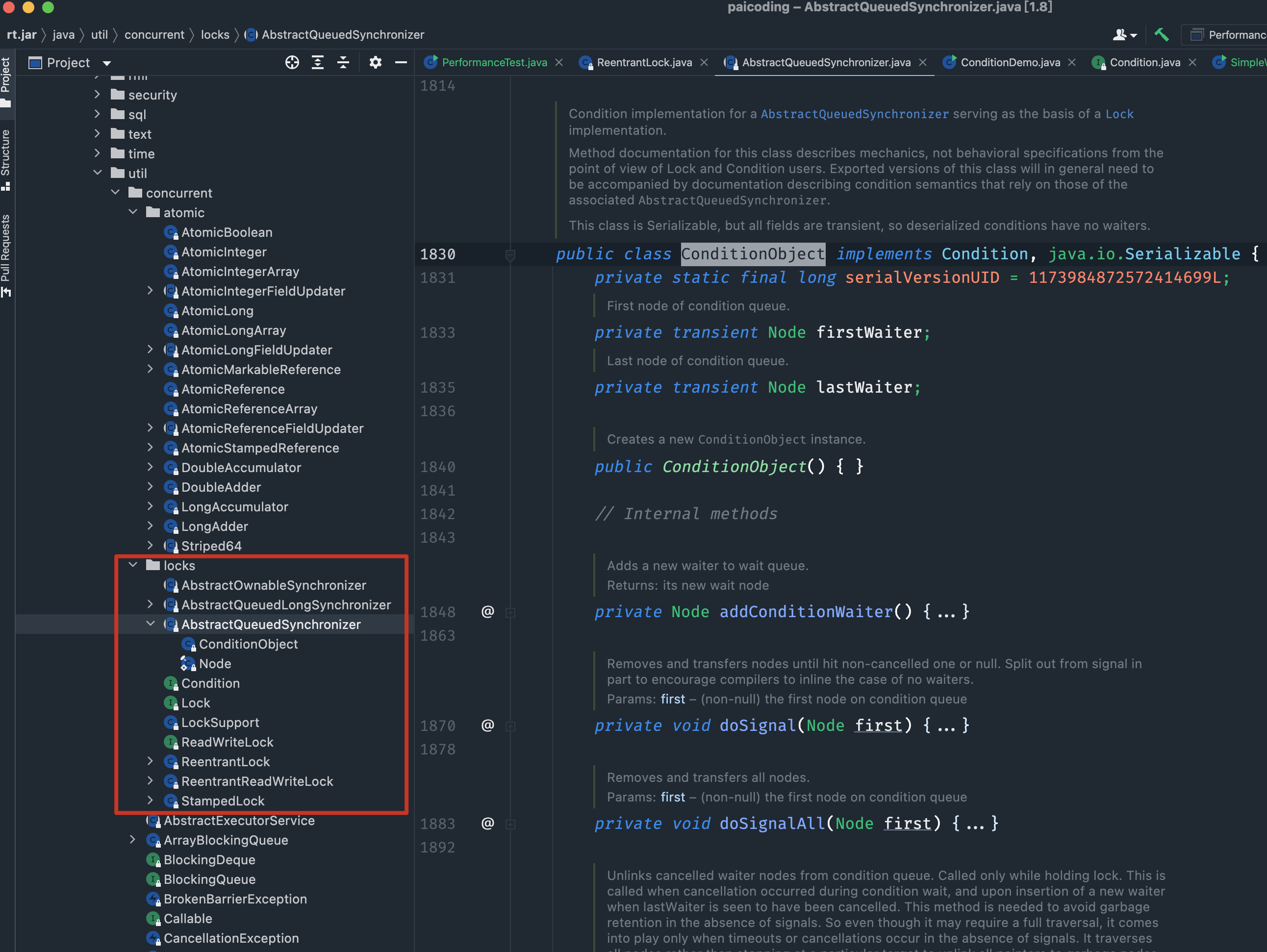 前面讲过了,Condition 只是一个接口,它的实现类为 ConditionObject,是 AQS 的子类。