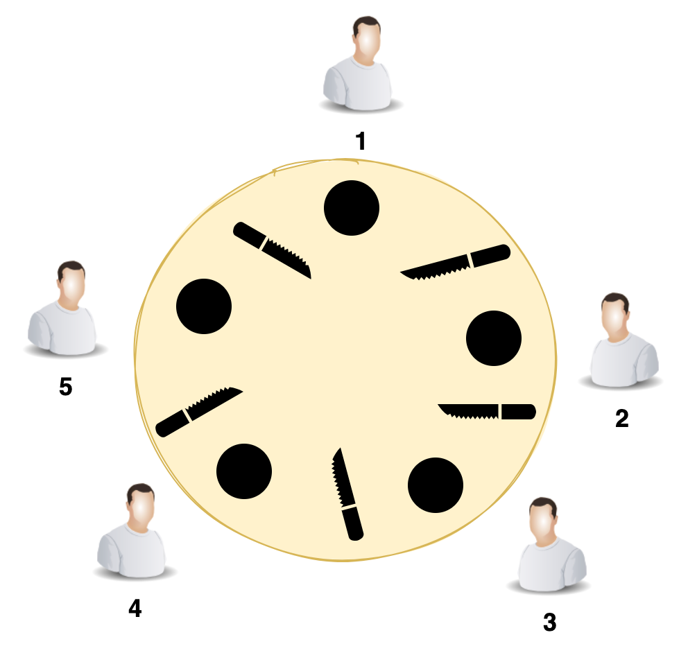 有一个非常经典的饥饿问题就是哲学家用餐问题,如下图所示,有五个哲学家在用餐,每个人必须要同时拿两把叉子才开始就餐,如果哲学家 1 和哲学家 3 同时开始就餐,那哲学家 2、4、5 就得饿肚子等待了。