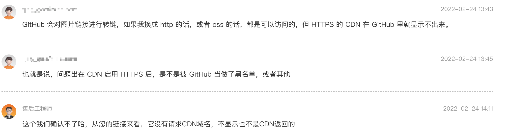 我以为,这位阿里售后工程师在收到我这个确凿的证据后,会稍微研究一番,结果没想到,他马上就开始正儿八经地甩锅了,“这个我们也确认不了,因为这个类似代理请求了,拿不到实际请求 CDN 的返回信息”。