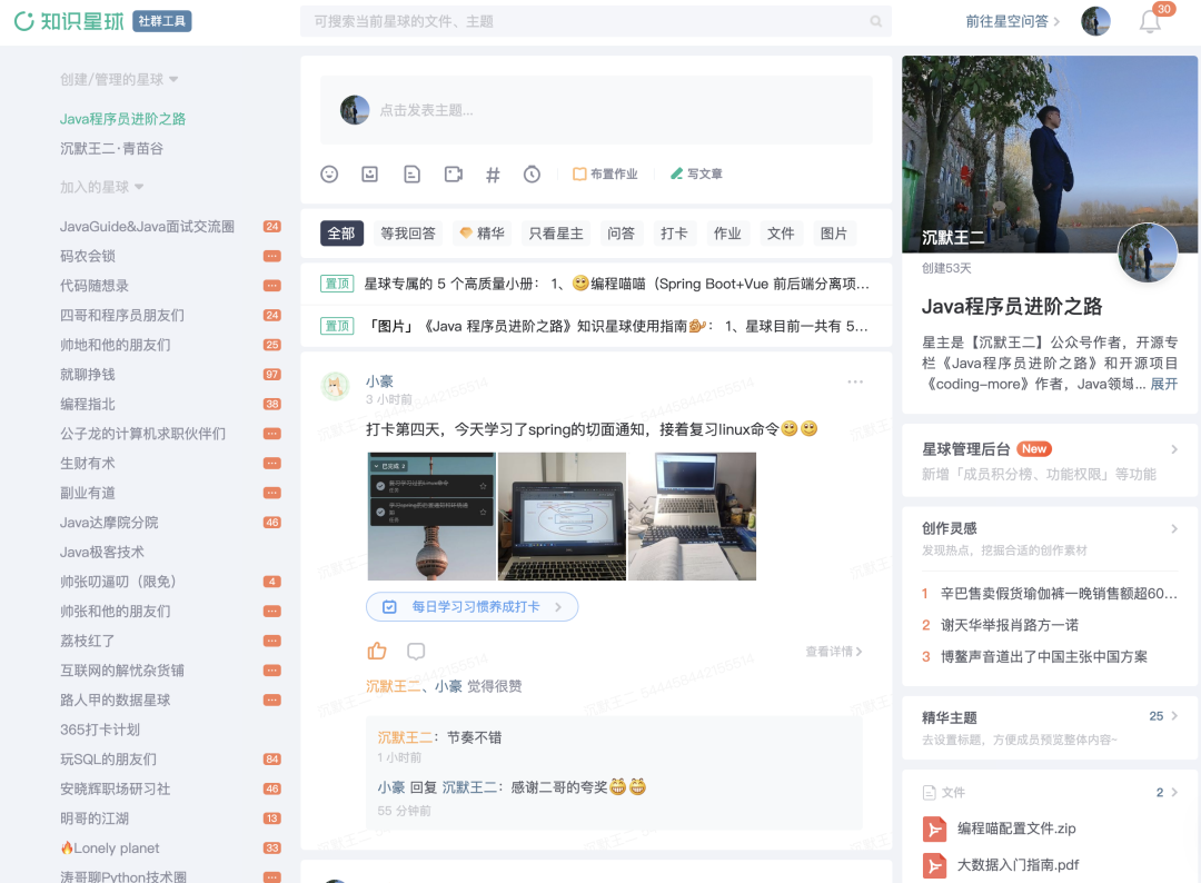 在星球里,你除了可以享用星主二哥提供的1V1 专属问题答复,学习路线/学习资源/职场经验分享外,还可以共享球友的学习笔记,参与打卡挑战,和一群热爱学习的小伙伴互动交流,从此变得乐观积极,动力满满,就好像每天嚼了两块益达,吃了两根士力架一样。