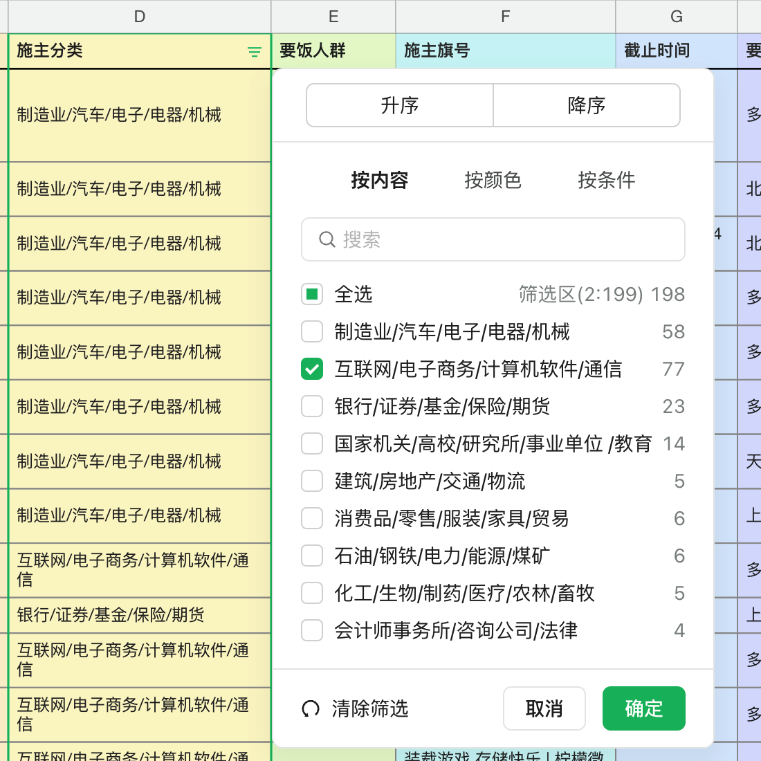 并且我会按照行业进行分类,比如说互联网-电子商务-计算机软件-通信,可以通过施主分类这一栏进行筛选。