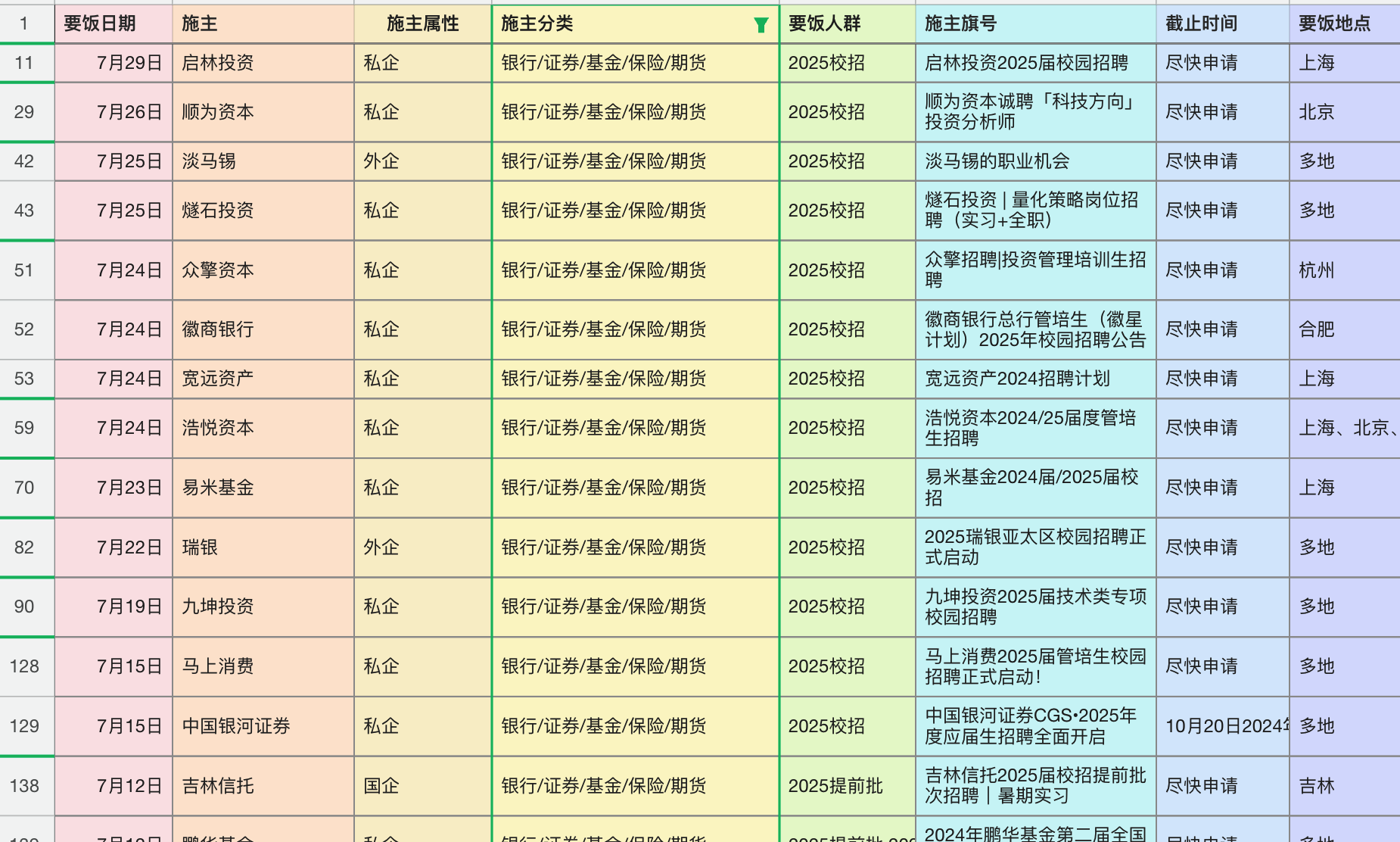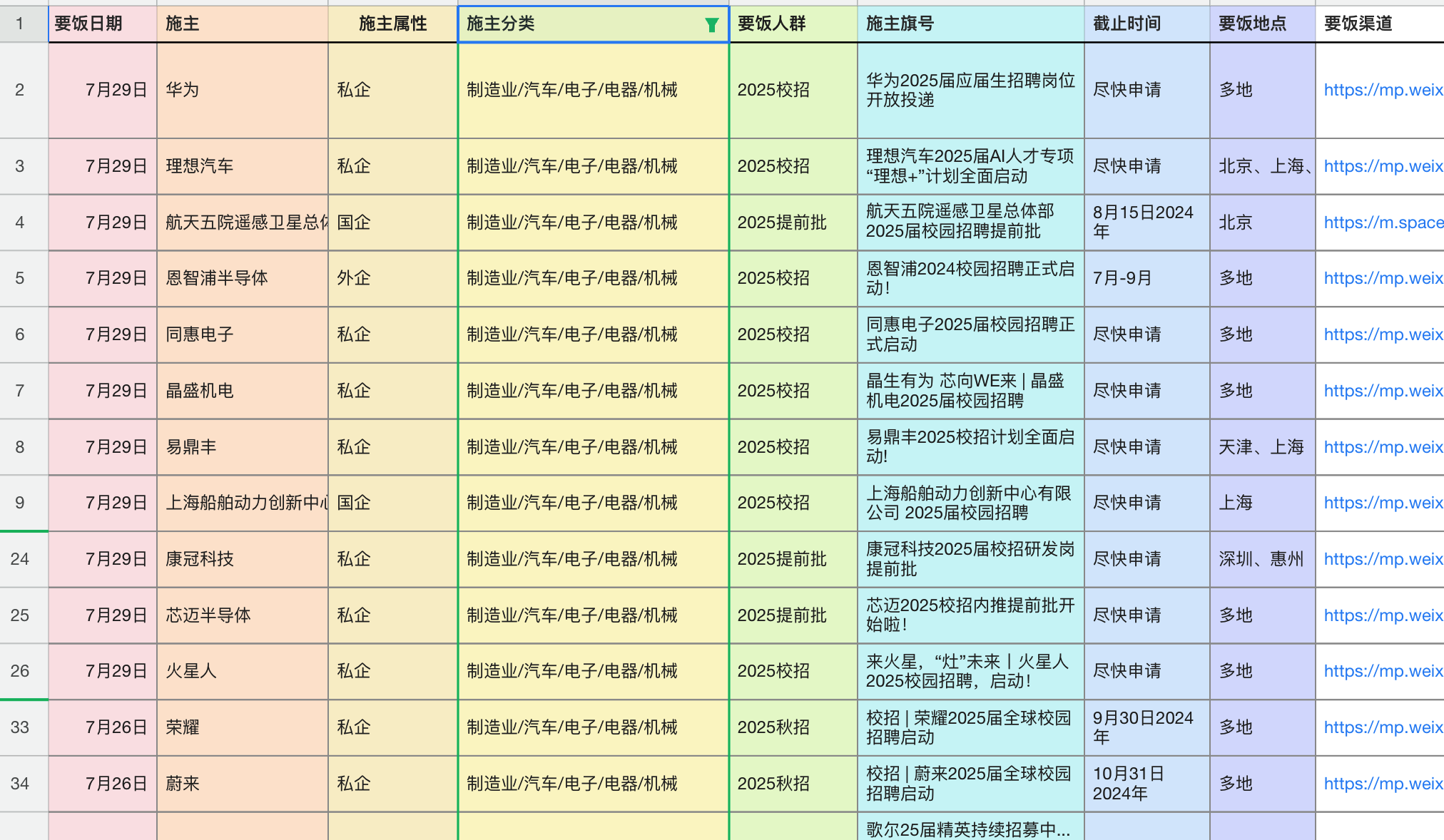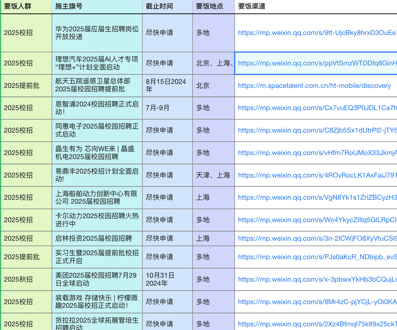 25 届秋招信息汇总表,各大互联网公司、车企、银行、国企、央企等